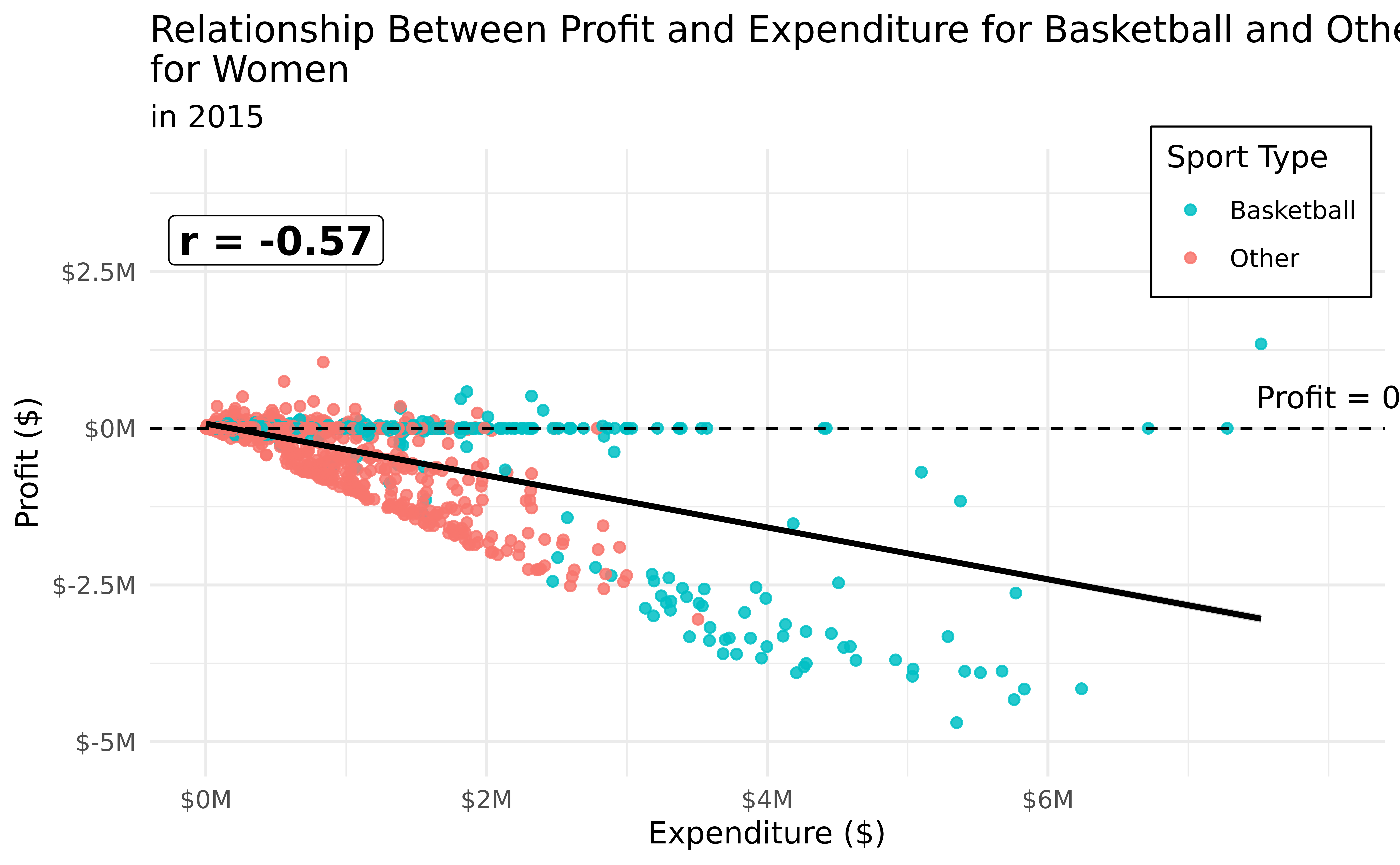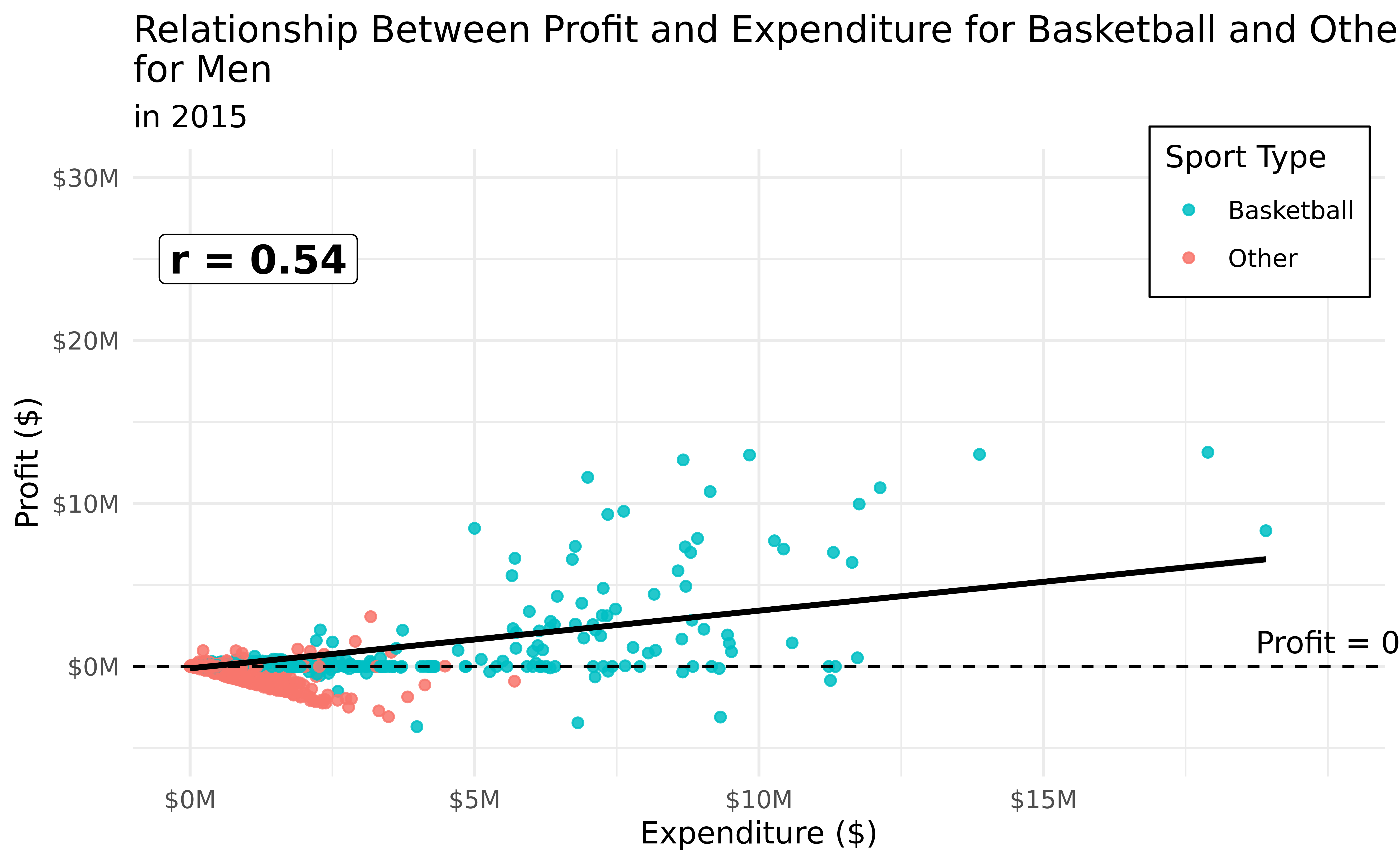 How do spending, revenue, and profit compare for men’s and women’s college sports, and how (if at all) did that relationship change from 2015 to 2019?