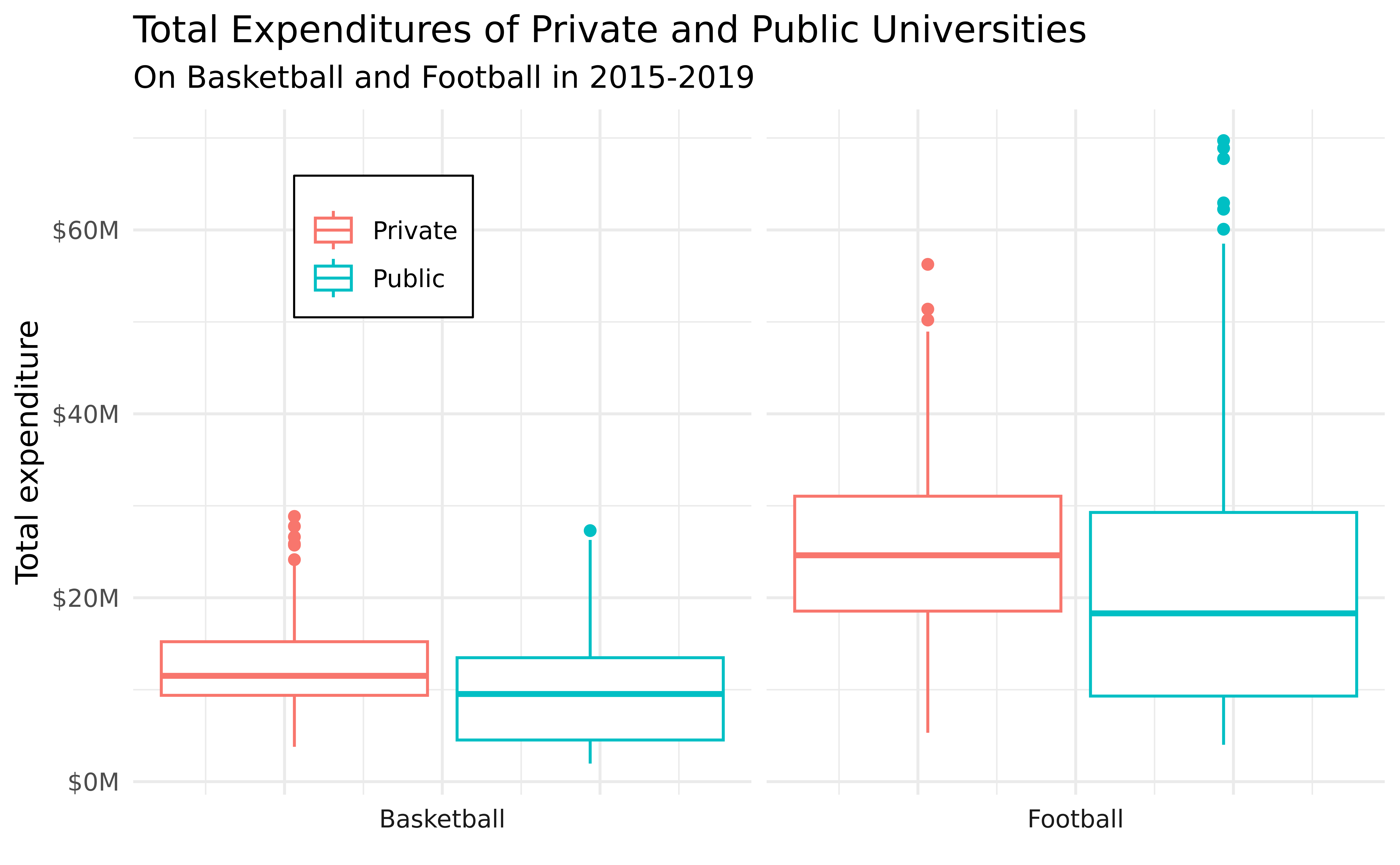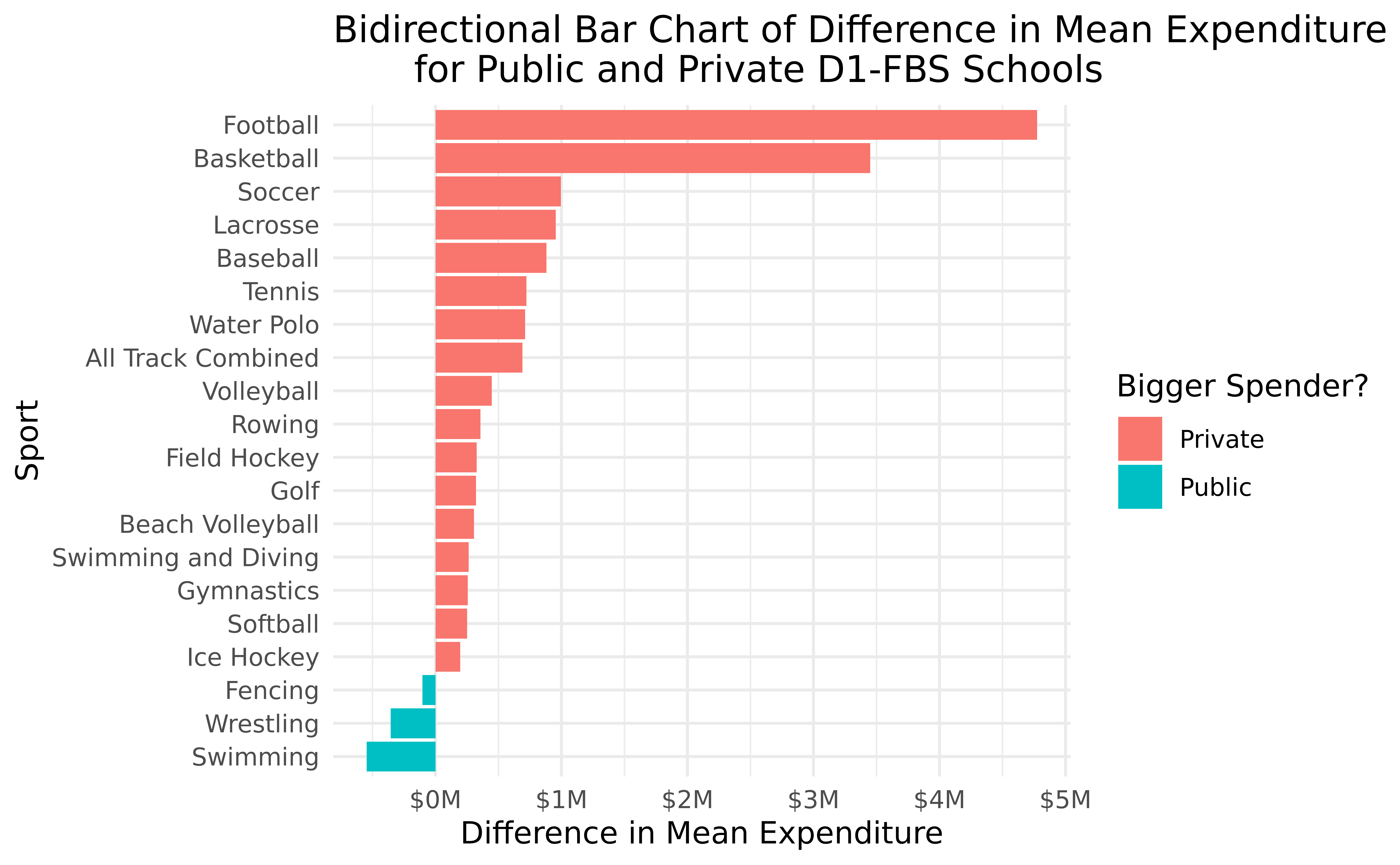 How does the expenditure on sports differ between public and private Division I-FBS Universities?