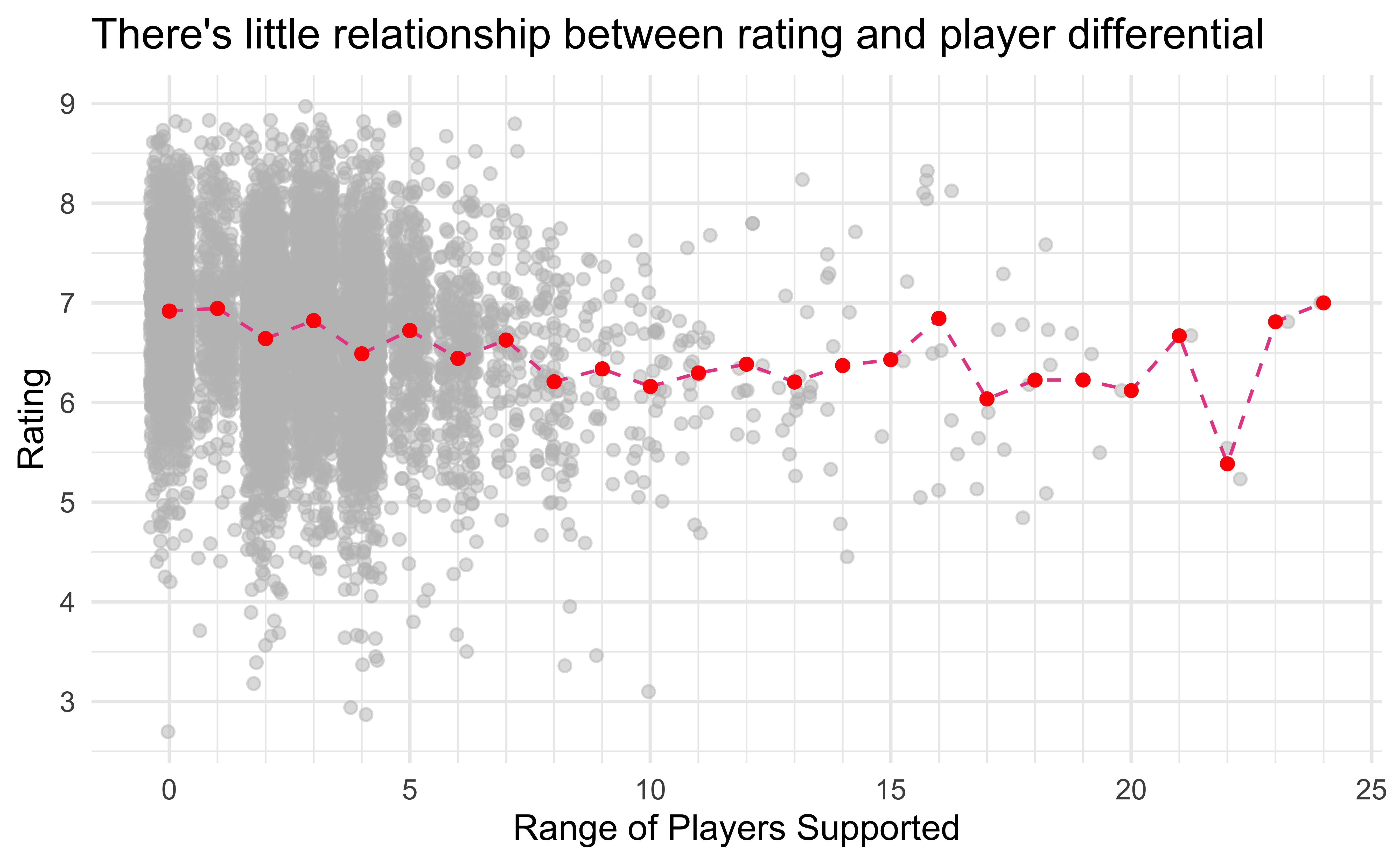 Does the range of total number of players supported tell us anything about a game’s rating?