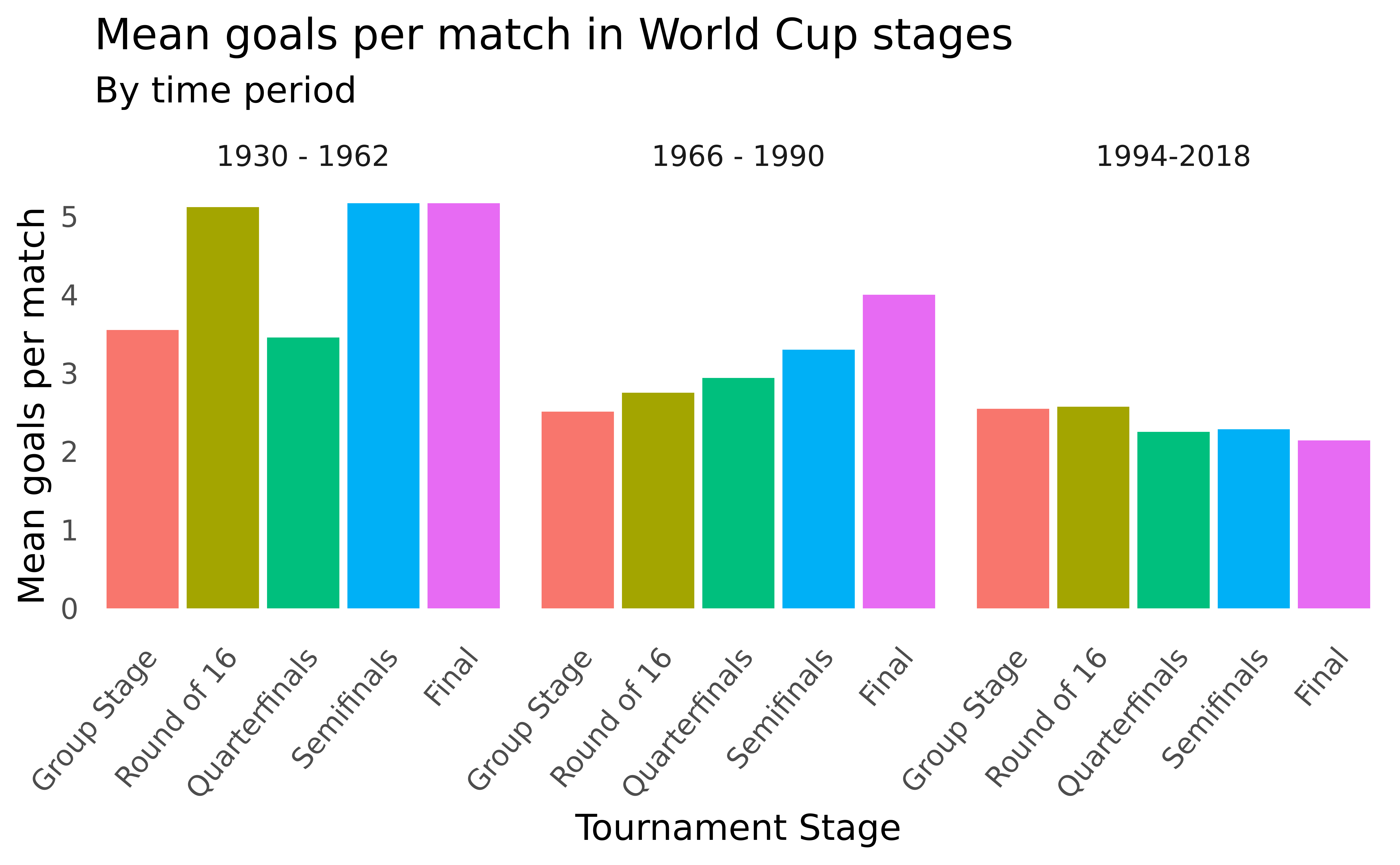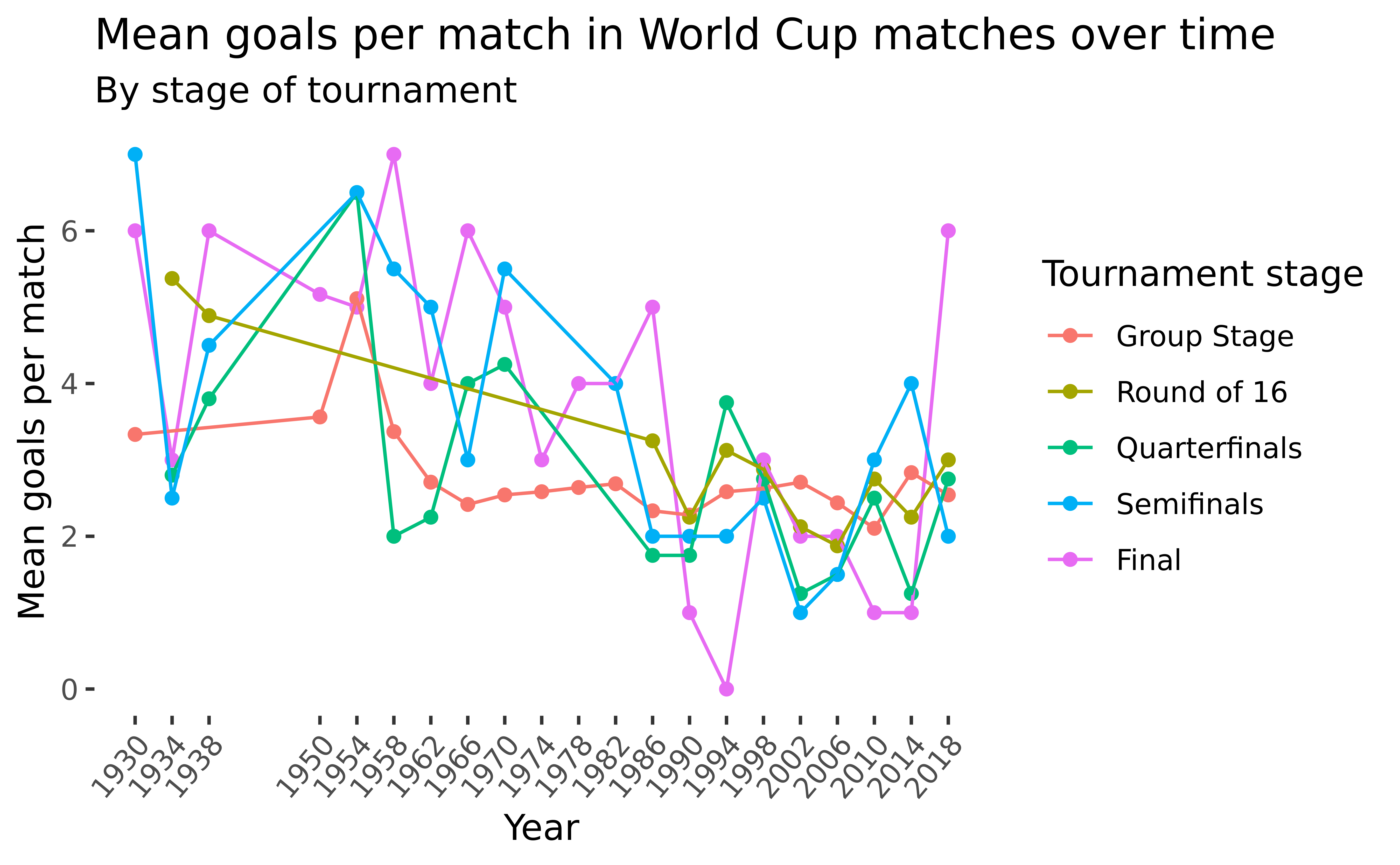 Overall, it seems that goals per match have declined over time with countries recently becoming more conservative in later rounds