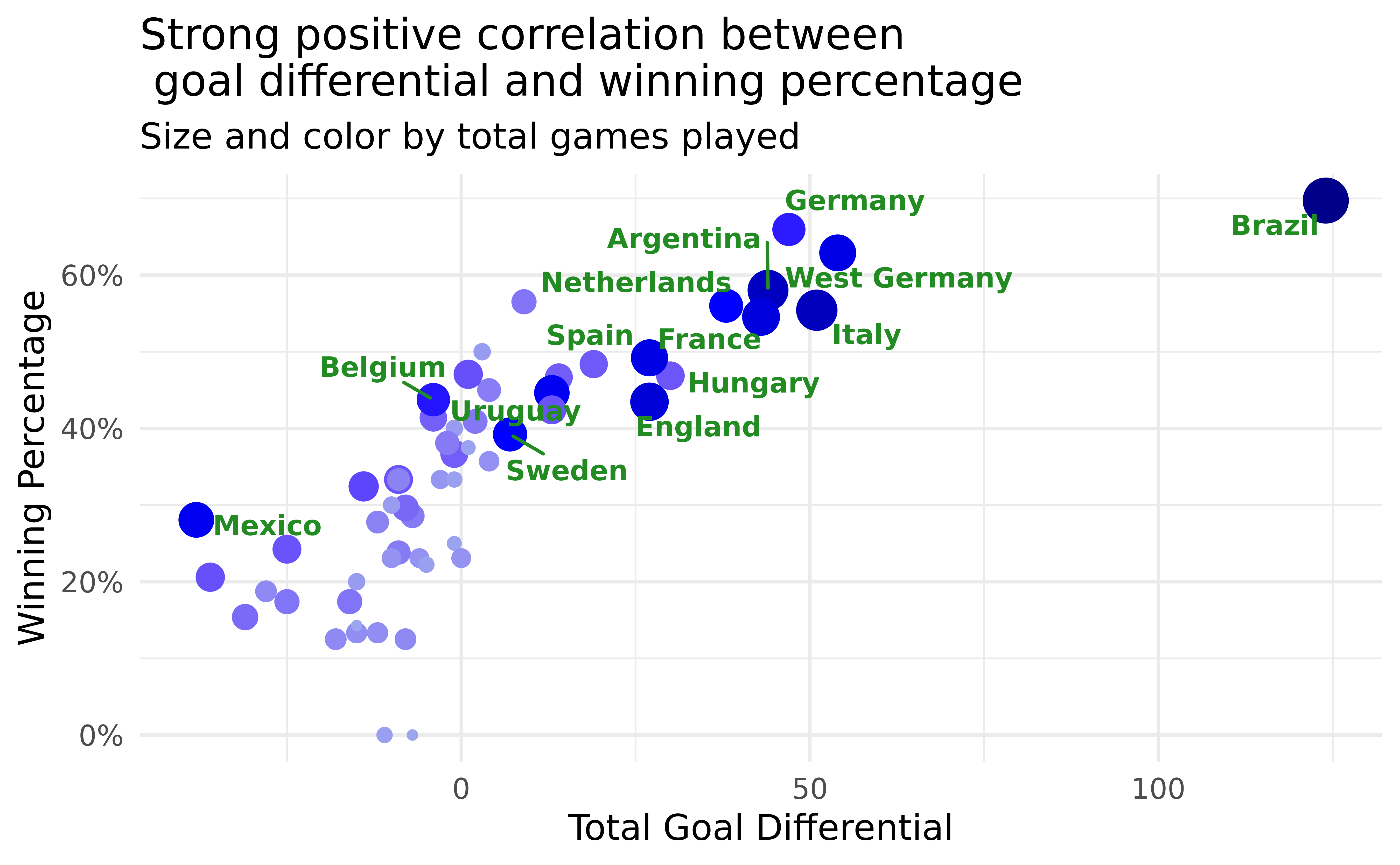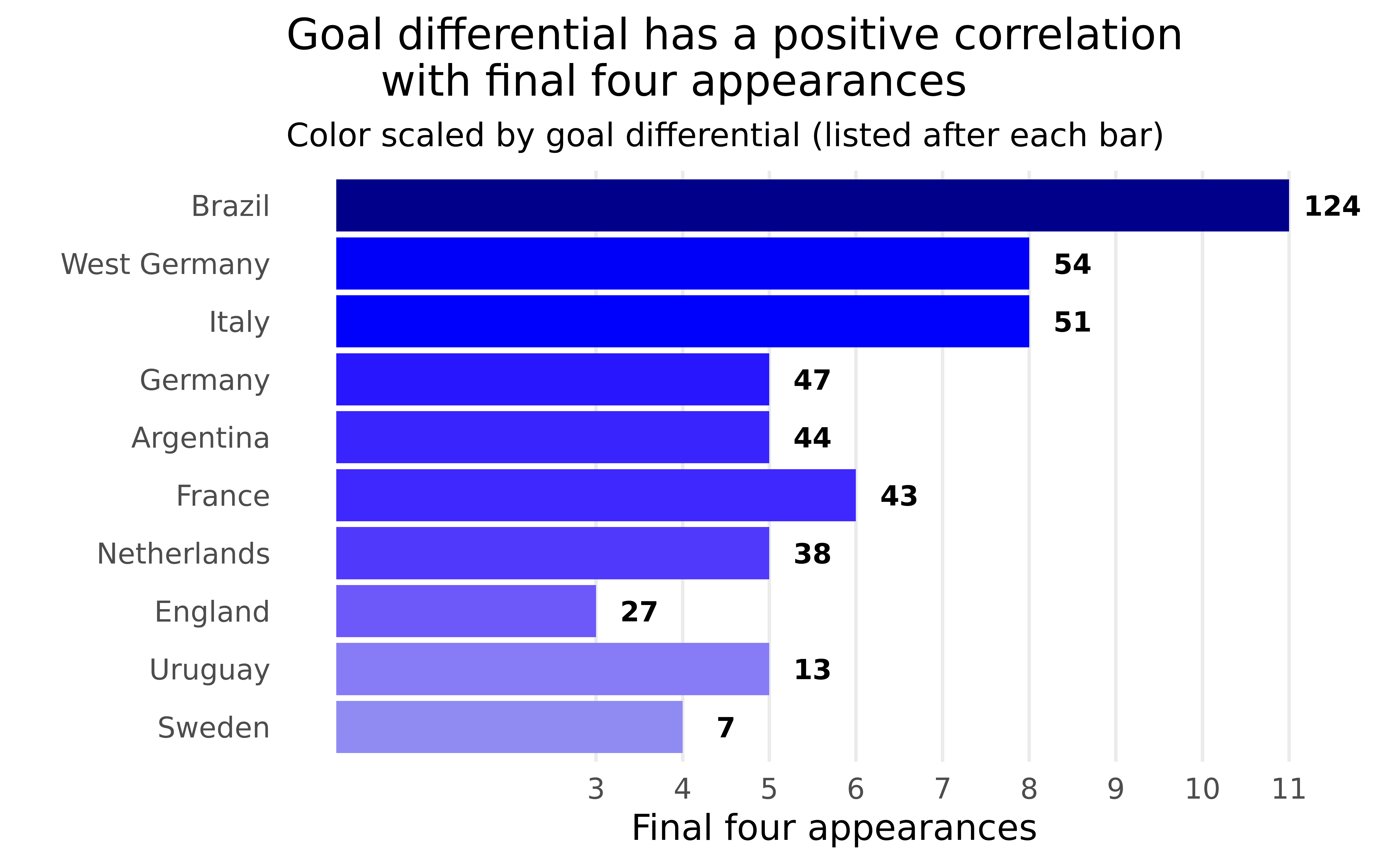 This research question has given us insight into which teams consistently perform the best in the history of the World Cup, that being Brazil, Germany, and Italy