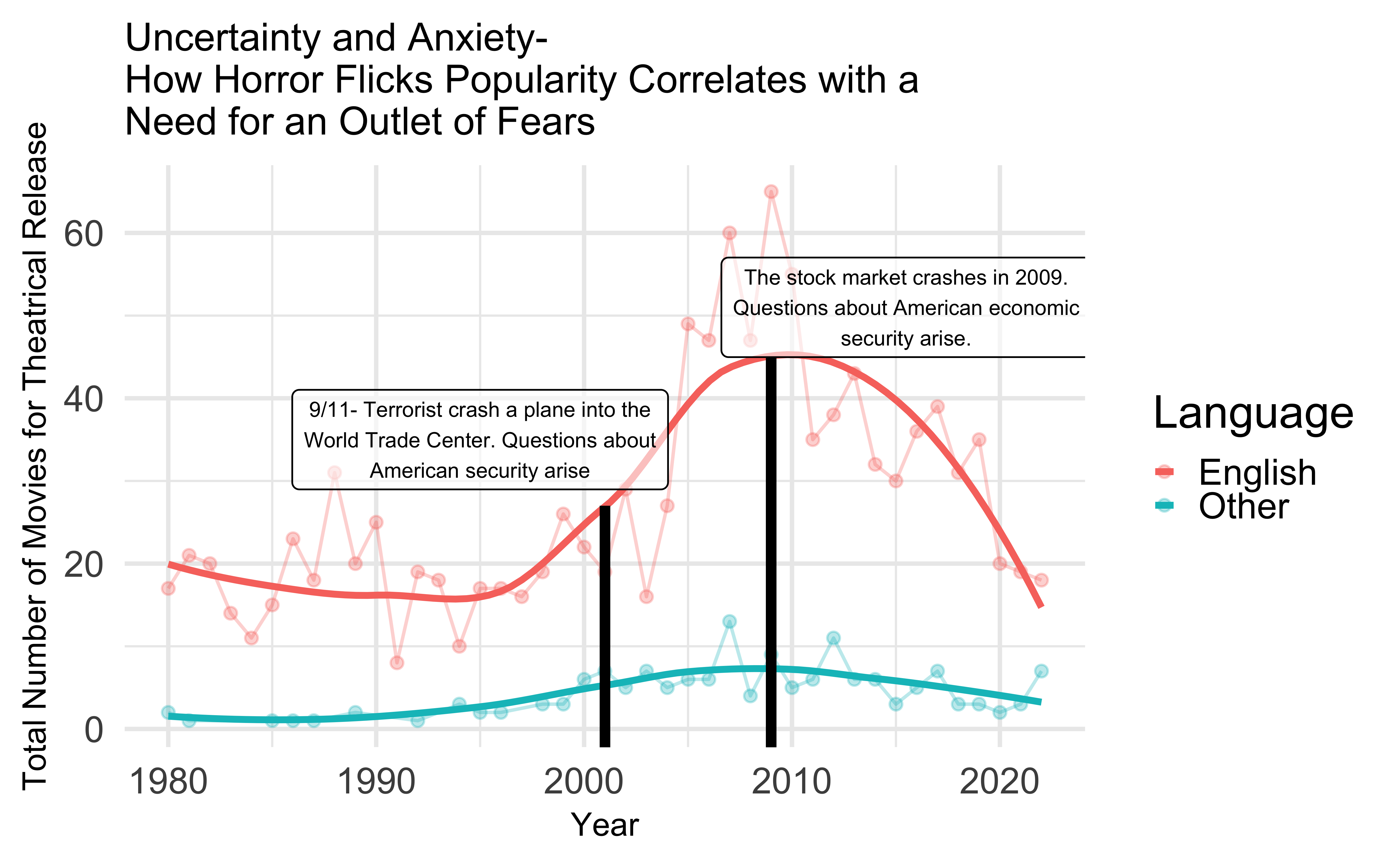 We first made a scatter plot where each point corresponded to the total number of horror movies made for theatrical release in each year. Because we wanted to look at individual observations (ie. the year 2009 and how many movies were made then) a scatter plot and then circling the observations we wanted to note would be the best way to do so. We then made a line plot using geom_line() and the used geom_smooth() to add a trend line. This plot wanted to initially look at the general trend of movie popularity over time and then relate it to the socioeconomic/political status of the United States at the time. Using geom_smooth() to create a trend line would easily allow us to see the direct impact of certain events on the popularity of horror movies while also allowing us to see when horror movies truly began to increase in popularity, decrease in popularity, and max out in popularity.
